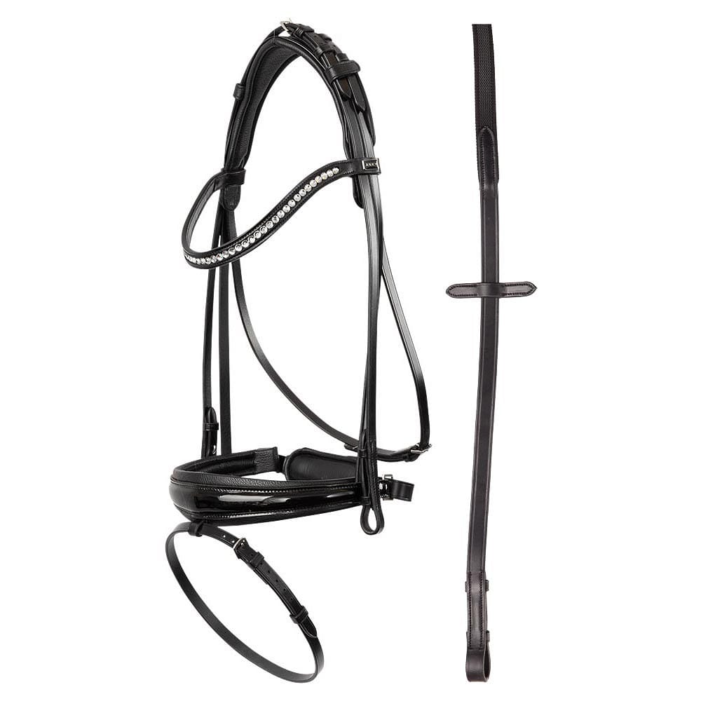 Detta vackra anatomiska träns utmärker sig för sin höga nivå av komfort och de lyxiga inslagen som lacket. och de glänsande imitationsdiamanterna. Spännena är placerade ovanpå huvudstycket och kindstyckenas spännen är försedda med blindspännen.