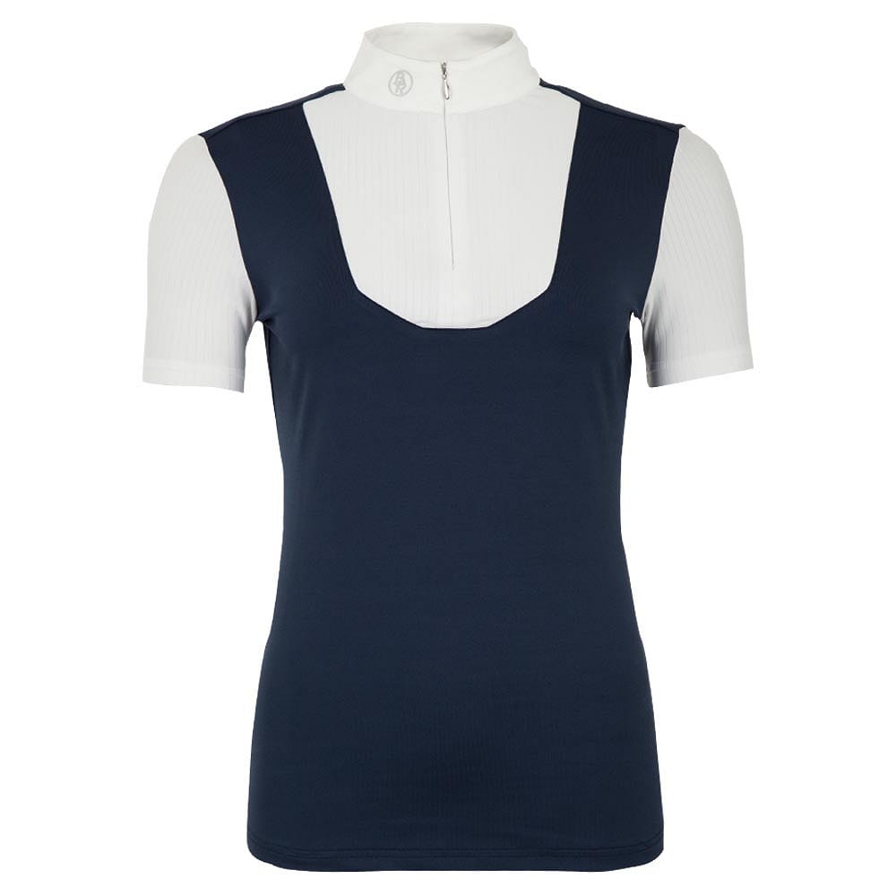 Snabbtorkande tävlingströja med fuktabsorberande egenskaper och en elegant och stilfull framtoning, utmärkt för varmare tävlingsdagar. Kragen stängs med en dold dragkedja och är prydd med en silverfärgad BR-logotyp i silikon. Ärmarna och en del av bröstet är tillverkade av ett kontrastmaterial med subtila linjer. Vänster ärm är dekorerad med en silverfärgad metall- BR-logotyp. Tävlingströjan finns i vitt eller vitt med en iögonfallande blå kontrastfärg.