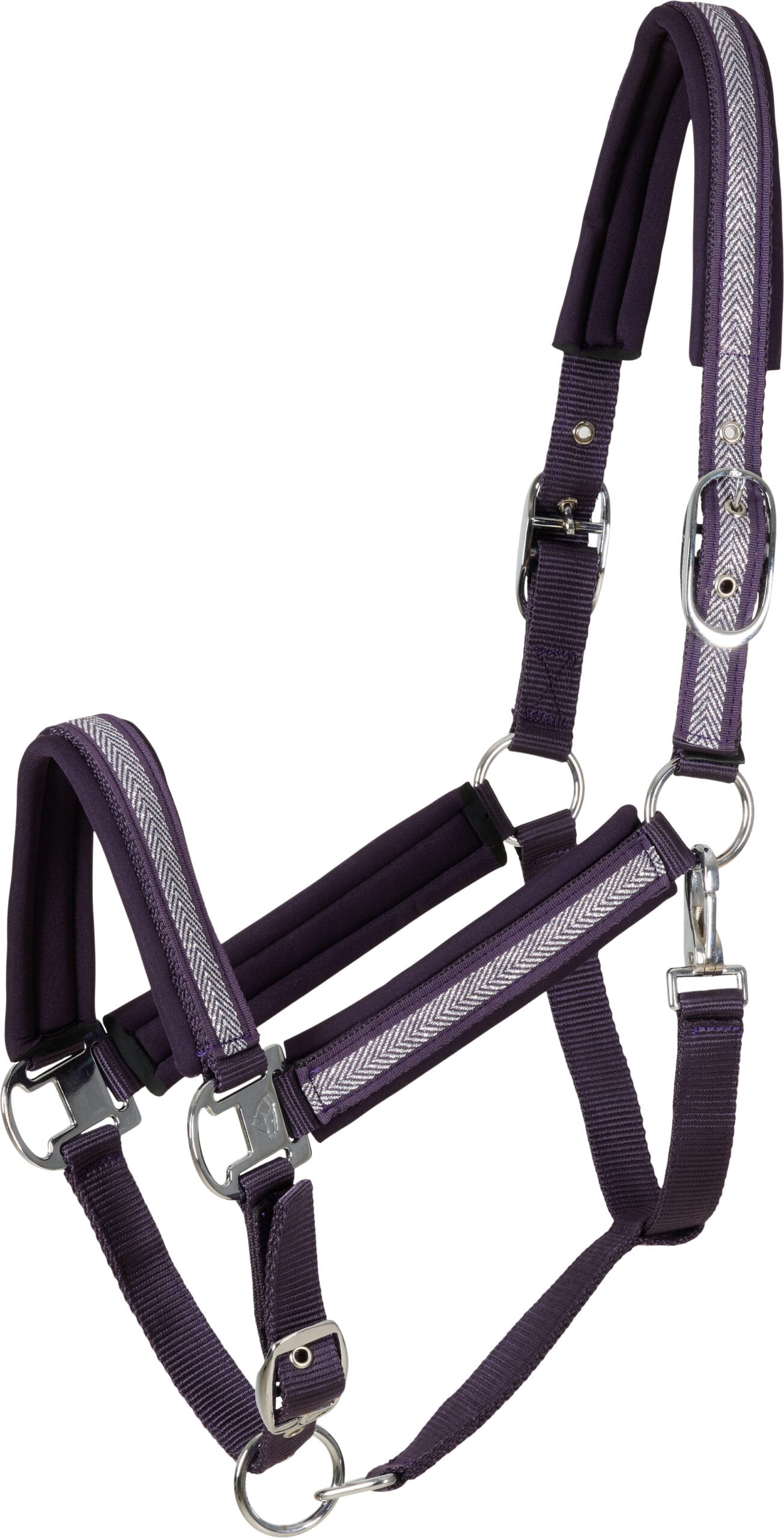 CATAGO Nate är en modern och väldesignad grimma med exklusiva detaljer som gör den till ett iögonfallande val i både vardag och på tävlingsplatsen. Grimman är tillverkad i slitstark nylonwebbing och har ett elegant metalliskt fiskbensmönster som löper längs nosgrimma, kindstycken och nackstycke. Både nosgrimman och nackstycket är justerbara för optimal passform, och kraftig neoprenvaddering ger extra komfort samt skydd mot skav. Färgmatchade beslag och metallöljetter vid hålen ger grimman ett genomtänkt och hållbart avslut.