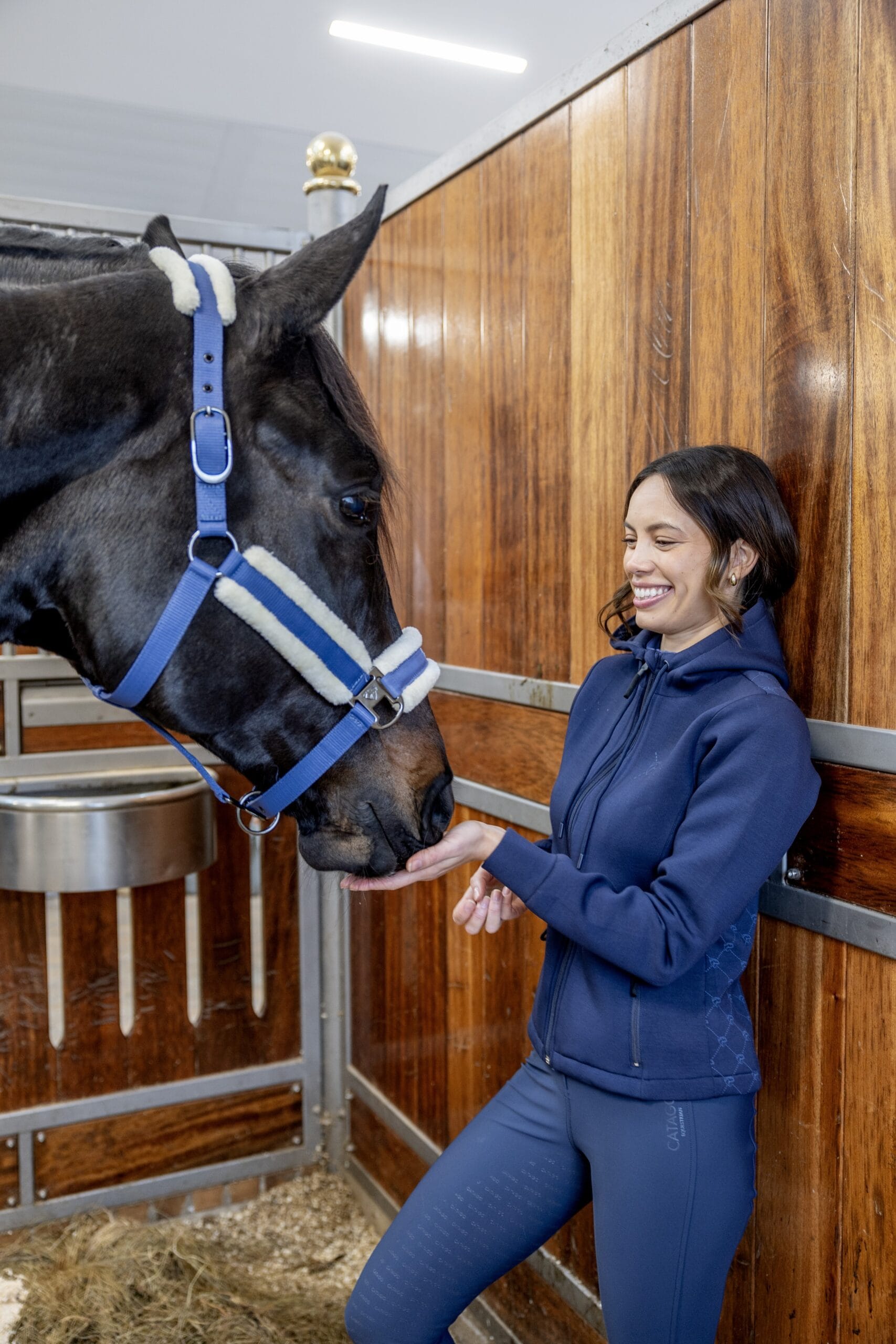 CATAGO Trace är en snygg och funktionell grimma tillverkad i slitstark nylon, designad för att ge hästen maximal komfort i vardagen. Grimman är mjukt fodrad med syntetiskt fårskinn över nosgrimma, kindstycken och nackstycke, vilket hjälper till att fördela trycket och motverka skav. Den dubbla justeringen i nackstycket möjliggör en flexibel passform, och designen fulländas av exklusiva detaljer som en metallskylt med CATAGO-logga samt diskreta logotryck på nosbandet. All hårdvara är i gun metal-finish för en stilren och modern look.