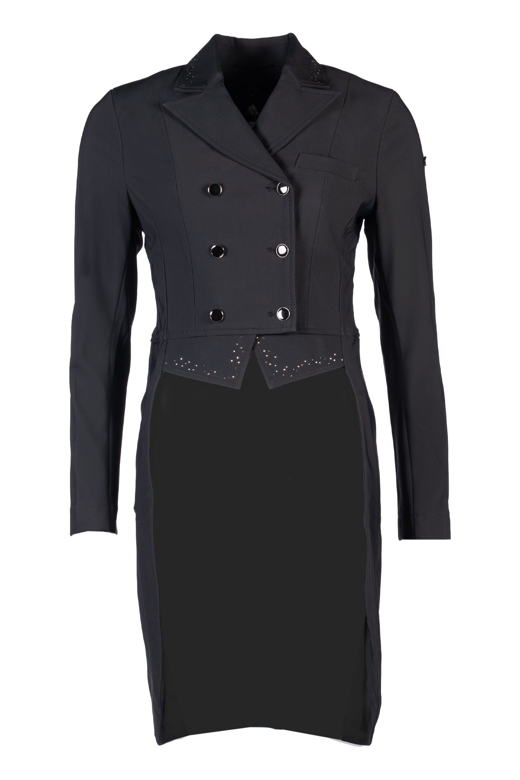 HKM Frack Jill för tävling är en stilfull tävlingsfrack designad för ryttare som vill göra ett elegant intryck på banan. Det följsamma stretchmaterialet ger hög komfort och rörelsefrihet, samtidigt som passformen framhäver en smickrande siluett. Fracken är dekorerad med fina kristaller som ger en exklusiv och iögonfallande finish – perfekt för dressyrtävlingar.