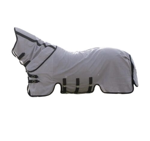 Tyger och material Flugtäcket är tillverkat av ett tätt strukturerat mesh-tyg som håller de flesta insekter borta. Meshtyget är extremt starkt och kommer att vara en idealisk följeslagare i många somrar. Tyget är slätt på insidan, vilket ger en mjuk känsla och säkerställer att inga hår fastnar i täcket. Tack vare täckets ljusa färg reflekteras solstrålarna och absorberar inte värme. Det fina meshtyget möjliggör fortfarande luftgenomsläpplighet. Man-, bog- och svansområdena är fodrade med en slät polyester för att undvika skav.