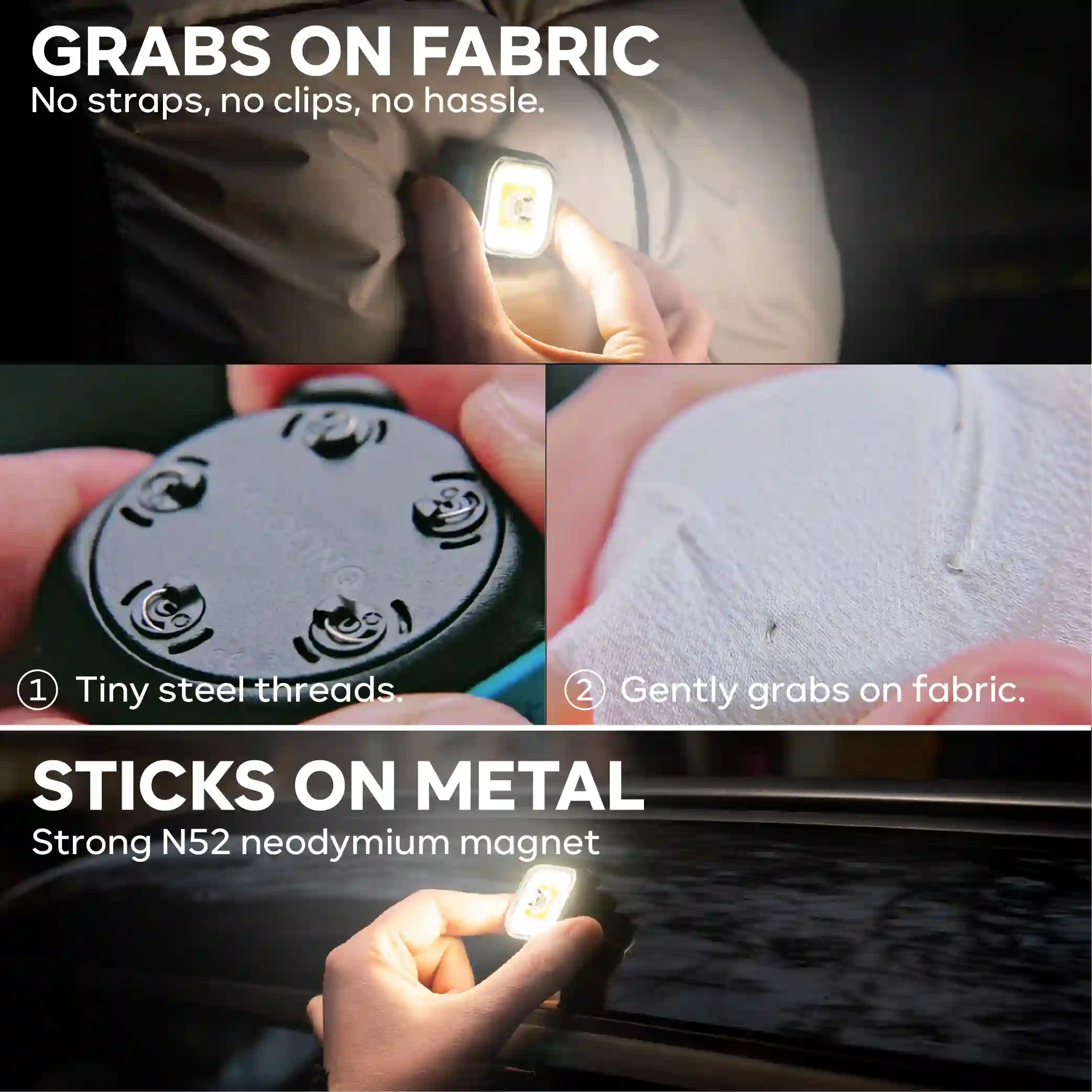 Light01 är en stark och pålitlig lampa utrustad med ett patenterat och innovativt fästsystem, som gör den enkel att fästa på kläder eller utrustning – helt utan att skada tyget eller lämna märken.