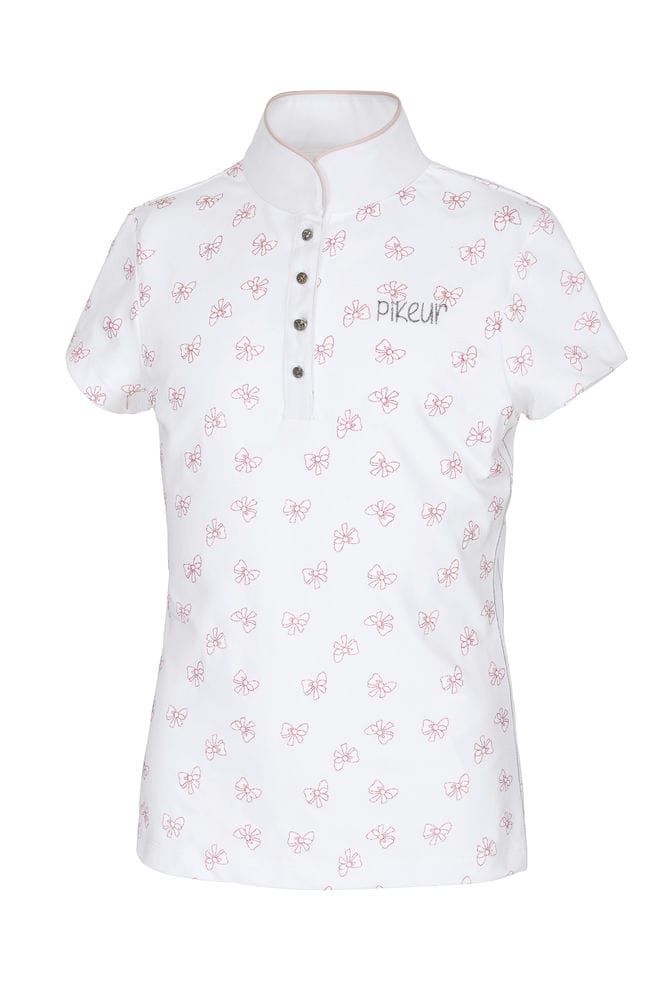 Fin, klassisk tävlingstopp för barn, från Pikeur. Kortärmad, med knappar. Finns i två olika mönster – med rosa rosetter eller grå ränder.