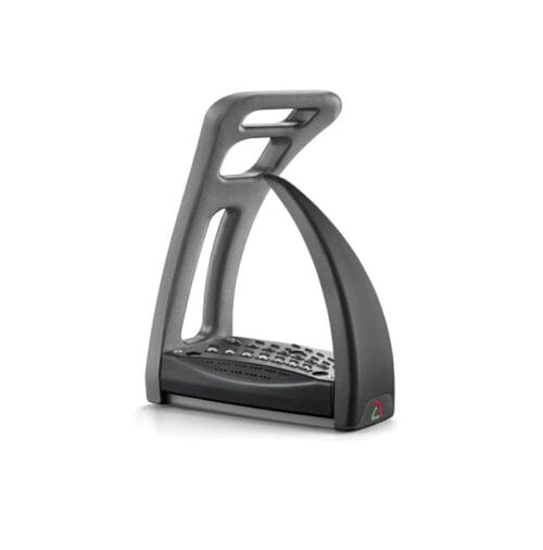 Stigbygeln är dessutom ergonomisk med en stötdämpande och tiltande fotplatta med ett revolutionerande greppsystem. Detta gör att stigbygeln anpassar sig efter ryttarens rörelse, och minskar stötar som i längden kan orsaka smärta.